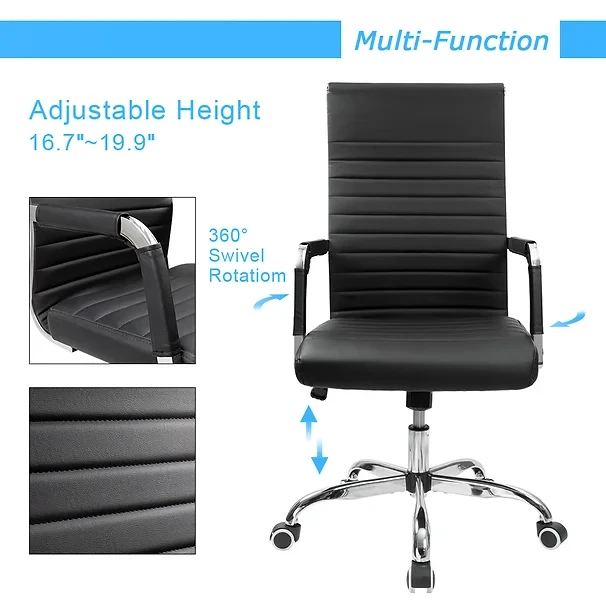 Upgraded seat: 3.15 inches thick padded seat for comfortable seating. Material: the smooth, pliable leather surface with ribbed stitching detail gives an upscale, luxurious feel. Higher back and lumbar design offer long time support from lumbar to head, provide continuous comfortable working time! Flexible adjusting: 360 degrees swivel design and adjustable height from16.7" to 19.9". Can meet various working occasions. Great office chairs in office, conference, home, colleague, reception desk, etc. Offer extra comfort for a long time.
