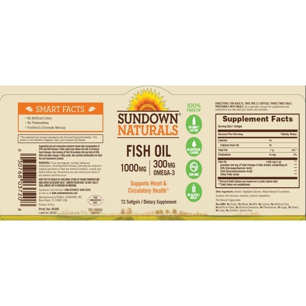 Support heart health with Sundown Fish Oil 1000mg softgels. (3) This fish oil Omega 3 supplement contains eicosapentaenoic acid (EPA) and docosahexaenoic acid (DHA), two fatty acids that help support and maintain the health of your cardiovascular system. (3) Each serving contains 300mg of Omega-3 fatty acids and contributes to healthy circulation and helps maintain healthy triglyceride levels already within a normal range. (3) In addition, EPA and DHA omega-3 fatty acids may reduce the risk of coronary heart disease. (2) For adults, take one (1) softgel three (3) times daily, preferably with meals. At Sundown, we believe in living clean (1)…and being transparent. That’s why you won’t find genetically modified ingredients, gluten, dairy, or artificial flavors in any of our products. Choose Sundown for premium clean vitamins, without the premium price. (1) Contains 72 softgels.