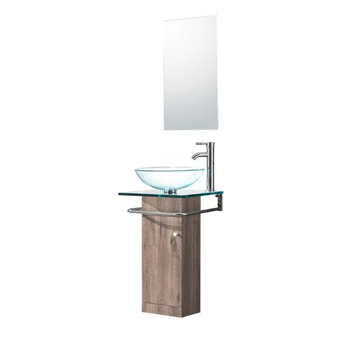 15West Keila Vanity Set with Light Oak Wood Finish | Includes: Clear tempered glass countertop and sink, single lever sink faucet with automatic drain included, polished chrome towel bar, one roll-top door, and matching mirror | Light oak grain finish | Measures: L: 75.9 cm x W: 25.9 cm x H: 81.02 cm | Net Weight: 67.42 lbs / 30.58 kg | Made in China.