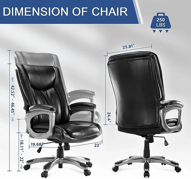High-quality Construction -- The high back office chair is made of high-quality PU leather with a high load capacity base with smooth and silent rollers. The maximum weight of the swivel work chair is 250 lbs. The scroll wheel can be rotated 360° and can be flexibly adjusted to your preferred position, providing freedom of movement and the convenience of communicating with others.